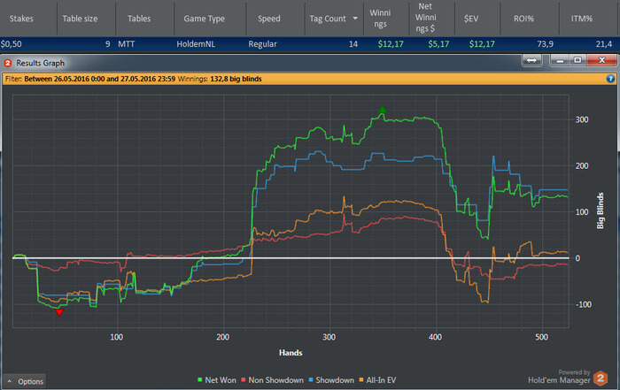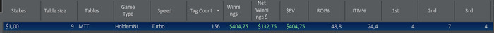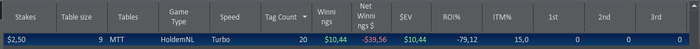 Но тут грянуло объединение со старзами и мои турниры убрали из лобби. Решил попытать счастье в MTTSNG 180 Players, Turbo за 2.50 но понял что сказка закончилась, и теперь надо начинать пахать. Толком даже в деньги попасть не могу. Хотя дистанции для MTTSNG 180 Players нет совсем, но затягивать с тем чтобы понять что я фиш не стоит))
