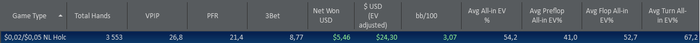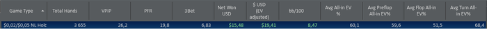 2) недостек с кривой статой, скорее всего рекреационный игрок. Но вот на сколько он агрессивен по такой выборке сказать трудно. Если по динамике он агромакакой был, тогда можно рассмотреть колы, но по мне лучше зарыть на терне, там будут конечно переодически блефы, но если он агроманки, то вскрывать их будет всегда дорого.