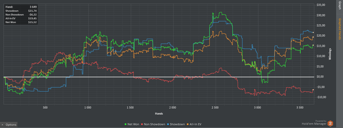 Cтолов 6; Мини сессий 6; Рук: 3655; Время = 360 мин; Результат = 15,48$; bb/100 = 8,47; Моя оценка = 3 з 10.