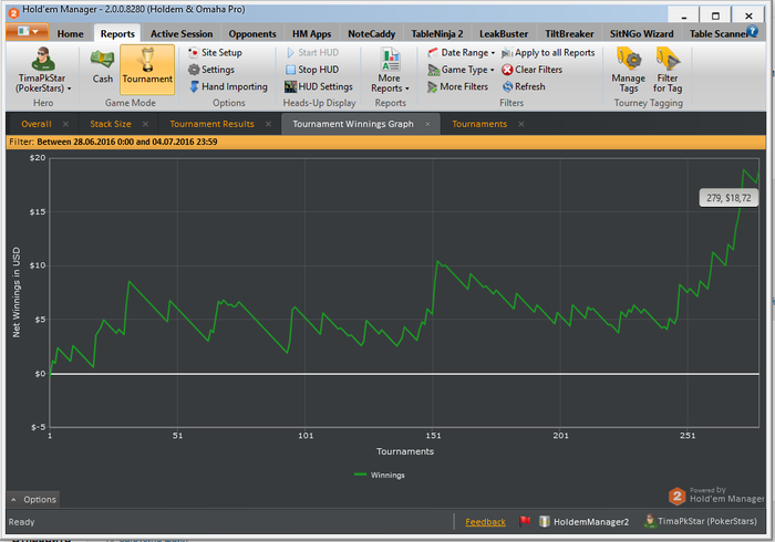График с начала марафона турниров сыграно 279 профит18.72$ 18.72$ не точные цифры так как я сделал ре-энтри в турнире за 0.27$ 18.72-0.27=18.45$ Общий профит 18.45$ за 6 дней.