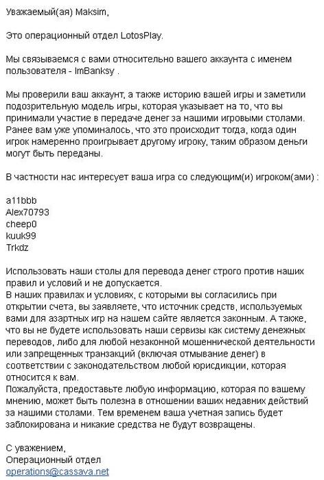 Добрый день. 3 июля мой счет на LotosPoker (ImBanksy) был заблокирован. 5го июля мне пришло письмо с обвинением в чипдампинге: