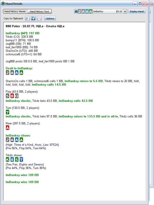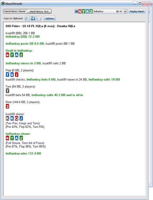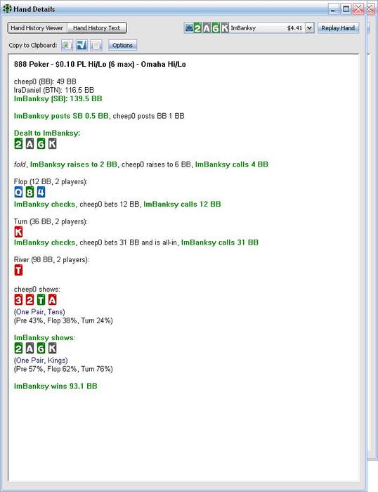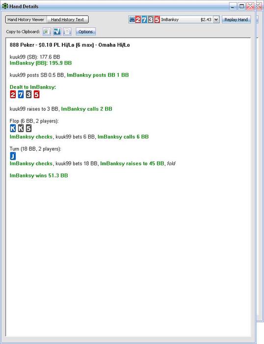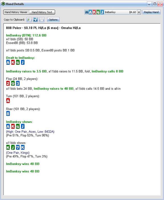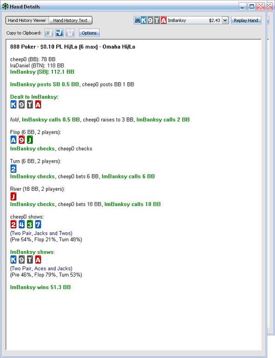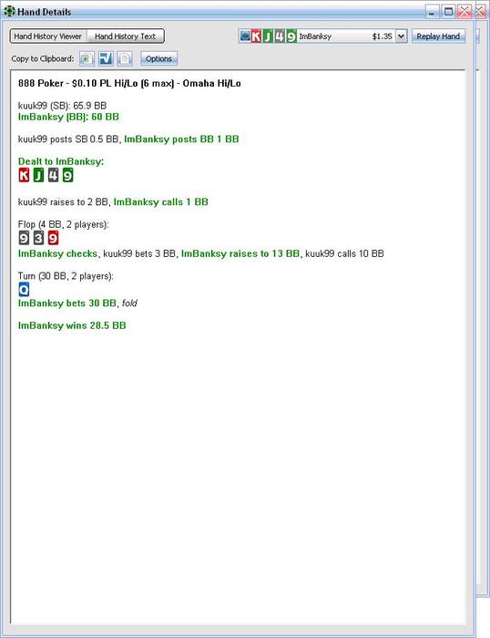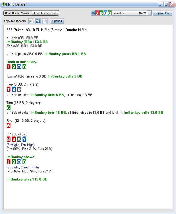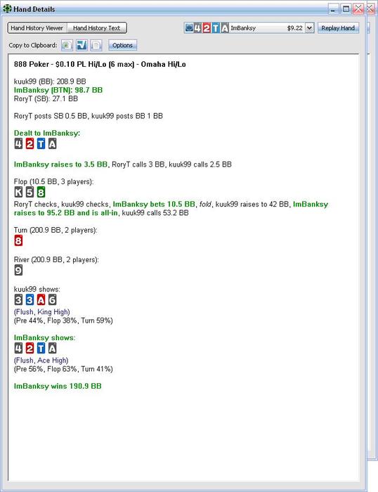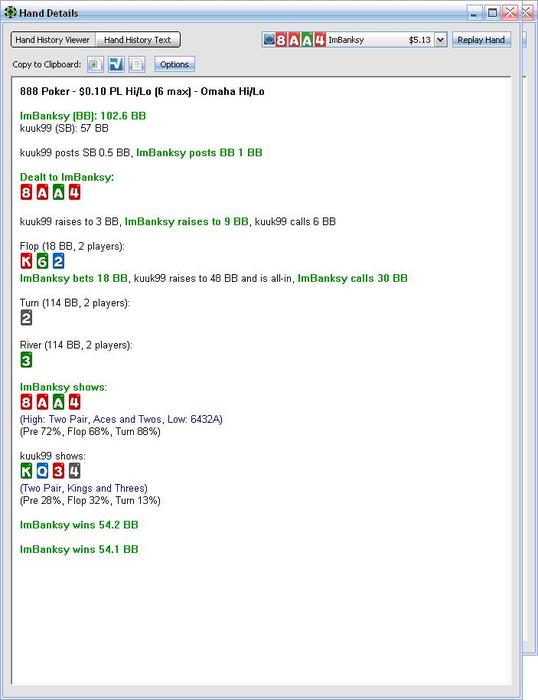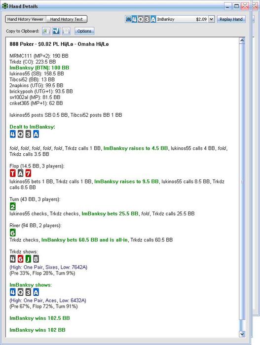 Что касается игры оппонента, то я, честно, теряюсь…Я не могу представить себе как можно так играть, скажу лишь, что его VPIP = 56, PFR = 36, а до шоудауна он дошел в 43% случаев. Может исходя из моей агрессии на флопе он предполагал, что у меня не будет лоу комбинации, не знаю.
