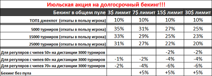 Бекинг для регуляров spin&go 1$-30$ лимитов. Предлагаю гибкую и справедливую систему откатов в зависимости от ваших результатов и кол-ва игры в месяц. Помимо бекинга помогаю с развитием игры и ростом по лимитам. Индивидуальный подход к каждому, запросы оставляйте в этой теме или в личку.