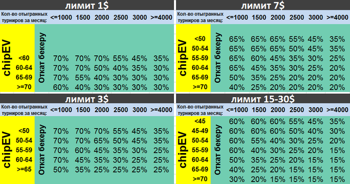 Запрос оставляйте в следующей форме: 1. Результаты на спинах: Играемый лимит - Дистанция - chipEV за турнир (можно с графиками) 2. Лимит, на который хотите бекинг. 3. Используемый софт 4. Причина бекинга 5. Ваши предложения по откатам (распределение прибыли между инвестором и игроком) 6. Какую долю готовы взять себе 7. Сколько столов играете - сколько турниров в месяц 8. Любую информацию о себе, о своем опыте в покере(графики приветствуются), которая может помочь принять мне решение о бекинге