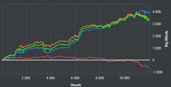 Все что запланировал сегодня сделал. Книгу почитал, конспект сделал, посмотрел вод по игре на микролимитах, отыграл 6 часов, 6178 рук. Вчера за это же время было почти 7к рук. Хоть и заработал +12,66$ игрой вообще недоволен. НУ даже не знаю как сказать. Большинство поля вообще не думают о картах соперника. И я на этом много раз ошибался. Например играю 2мя баррелями на терне и на ривере и предполагаю что все руки хуже топ пары скинут, а оппонент мне показывает 4ую карманную пару. Или на 4 флеш доске колят свой трипс, на 4 стритдро не могут выкинуть 2 мелкие пары и т.д. Много раз блефовал там где не нужно, делал дисперсионные колы от которых можно вообще отказаться.