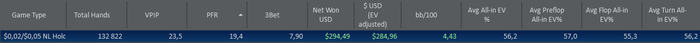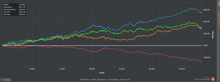 Net Won: 400,00$ (+ рейкбек 100$); Banrkoll 1000$. Total Hands: 100K; Winrate: 8/100; Status: PlatinumStar; Limit: NL10;