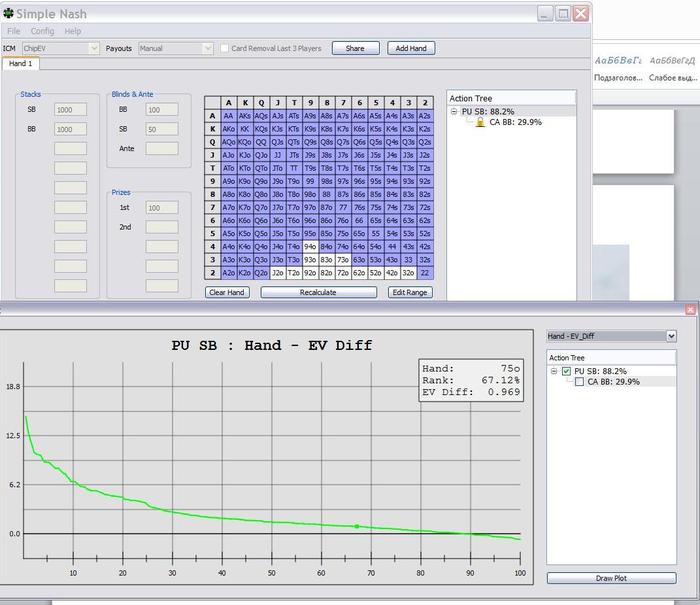 Пуш с любым диапазоном который даёт + является правильным решением, Никаких произведений не нужно делать. Исходя из того графика что ты выкладываешь, нам тут нужно пушить 90%... почти 90%. И Мы обязаны считаться с слабоплюсовыми пушами и делать их. А всё дело вот в чём. Когда пушфолдный софт предлагает нам сделать пуш, он считает разницу между двумя действиями. Всякий раз когда пуш выгоднее чем пас нужно пушить. Удачи за столами :)