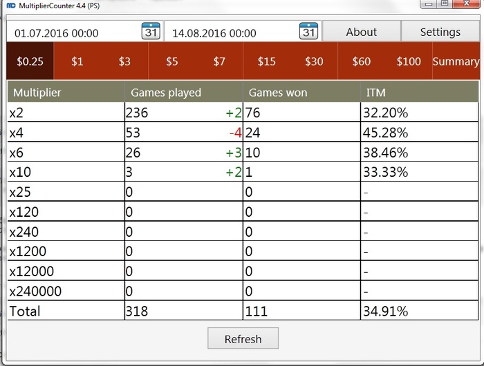 2. Нашла такого зверя,как Multiplier Counter и вот итог за мои 373 турнира из 1го поста(только куда то он потерял 44 турнира ,в этом я пока не разобралась)