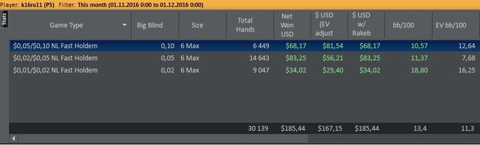 С покером знаком с ноября прошлого года, не получал ничего ни от кого в те золотые времена, когда все катали нл1000000+. В один день друган меня достал, я тогда поигрывал в хартстоун, и он меня пилил при каждом удобном случае, что я не в те карты играю. Пришлось изучать те. Сначала катал sng, mtt на pokerastars, потом уговорили зарегистрироваться на 888 от академии покера (не реклама), где катал турики до февраля. В феврале перешел в кэш. За 1 месяц побил нл5 и нл10 по МСС стратегии. С марта этого года играю БСС. За март побил нл5 рег столы, за апрель нл10 рег столы и прогресс встал. Начал заниматься индивидуально (очень повезло с тренером, хз что было бы, если б нас не познакомили) и вернулся на старзы. За конец мая и июнь побил нл10 зум, попробовал нл25 не пошло, вернулся на нл10. Подтянул теорию и июль откатал нл25 зум в 0. Сейчас пытаюсь поднять винрейт до 3-4 бб/100. Что-то получается, что-то нет. На 888 больше не играю, считаю это пустой тратой времени. Только старзы, только зум 6 макс.