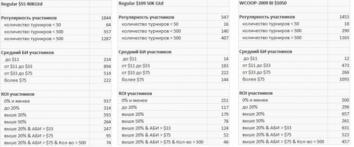У меня есть срез данных по регулярному турниру за $55 - 90К Gtd, могу выложить его в таком же формате или более интересном к которому прийдем во время обсуждения, после чего предлагаю посмотреть данные по турниру ВКУП-2009 500К Gtd c BI $1050.
