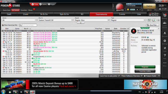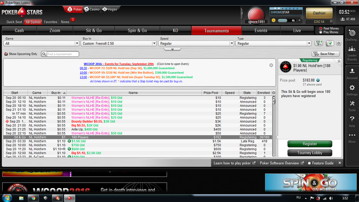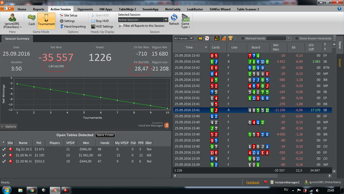 Итог за 22 сентября, сегодня откатал в -3$. Предфиналки на 180 чел. не тащятся что то. Несколько начинает теряться тот настрой мотивирующий играть который был. Сегодня за собой заметил утром 2 плохих розыгрыша и косяк в размере сайзинга конт бета, и в вечерней загрузке в 3-х раздачах плохо сыграл. Вообщем надо собраться. Завтра собираюсь больше турниров отыграть, чем сегодня, а то за сегодня всего 22 турнира отыграно примерно