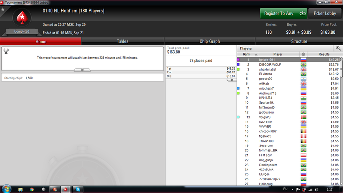 Итог игры за 16 сентября с утра начал грузится с 11:30 грузил мтснг 45 чел 180 чел. и биг за 1.10 и играл до 18:30. Загрузка столов с утра очень долгая я грузил на 180 чел. снг только 3 стола вроде загрузить успел до 14 часов или 4 стола точно не помню. Утренней игрой своей доволен был + 9 бб на 100 по ев отыграл 26 турниров, начал по 8 столов катать, пока что не очень, но буду привыкать утром в биге за 1.10 вылетел 22-м и занял 4-е место на 180 чел. про 45 чел думаю смысла нет писать в итоге в конце утреней загрузки закончил + 26$, своей вечерней загрузки с 20:15 я был не доволен своей игрой, но доволен своим результатом на апстрике занес 1-е место на 180 чел.