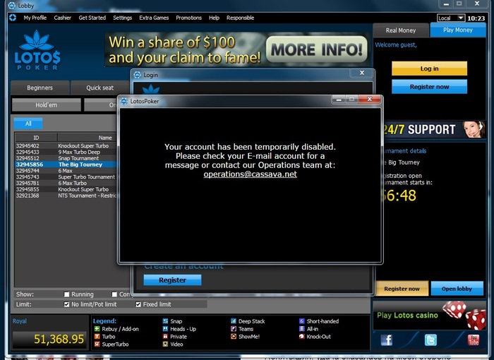 Пожалуйста, предоставьте любую информацию, которая по вашему мнению, может быть полезна в отношении ваших недавних действий за нашими столами. Тем временем ваша учетная запись будет заблокирована и никакие средства не будут возвращены.