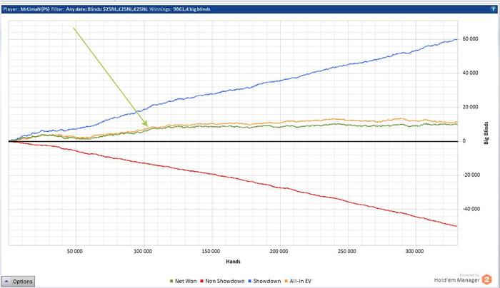 Так же я готов утверждать что при раздаче карт на большой дистанции гсч учитывает винрейты, просев на нл100 я не могу играть нормально нл50, а так же нл25, пока там винрейт не просядет. Как показал мой горький опыт - красная линия так же привязана к аккаунту.