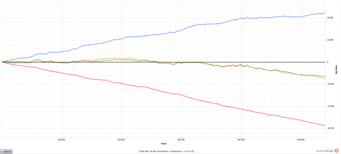 Для меня покер был чем то большим чем просто игра, был некоторый элемент спорта, я стремился думать быстрее. Достичь СНЕ в 2015. А как ты думаешь - рег вообще ничего понимать не может? Ты предлогаешь понять и простить. Нет, я здесь не для этого. Другие румы? Ок, я не играл в других так серьезно, разве что патипокер. Но я верил так же как веришь сейчас ты. Рыба рыбе.. Хорошо, но деньги то текут справа налево! Про селект молчу. реги нл25-50 если зайдут то скажут - полюбому плюсанут за селект. Какие споты именно. Называй. Кину фильтр, кину регов от туда же и их бб на сто. топят в основно БТН и фиши показывают 2 пары+ а так же отказываются колить доминируемые руки. 10 столов ты играй, до хоть 30 и 50 столов - ты это будешь видеть! Так же смею обратить твое внимание на красную линию, она просто заколдованная тянется к -20бб после нл100. Я как бы разучился играть после сотки. во второй раз.. И тебе мир!