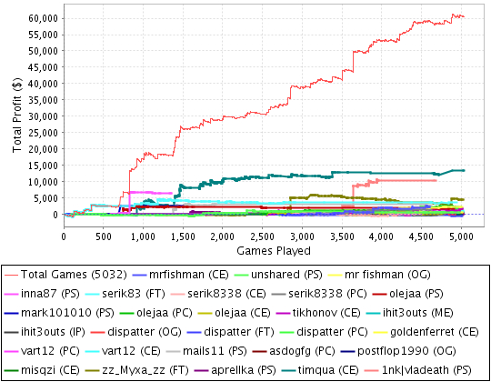 В 20-00 начался 6-макс КО. Я, Олежа и Вадим настоооооолько неудачно вытащили бумажки с номерами, что попали за один стол. Оппы попались просто отличные: залетный дяденька-турист, который постоянно делал колдколлы всего, что двигалось в центр стола; серьезный мужик, который зачем-то одел очки, при этом жестоко переигрывал руки типа А9; интересная мадам, которая по сути играла средненько, но безумно любила блефовать (собственно говоря, потом за другим столом она удвоила мне и без того хороший стэк на чистом блефе). Удалось забрать несколько средних банков.