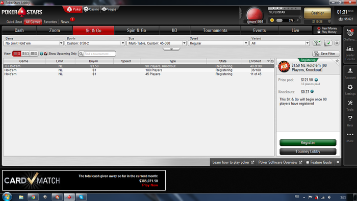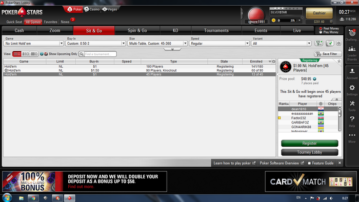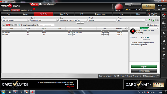 печально было 2 финалки на 180 чел. и вылетел с плохими призовыми только 6-е и 7-е место, вышел в + за счет 1-го места на 45 чел. Счас бр 110$