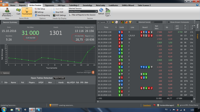 День 2-й (15 октября). Итог за сегодня +15$. Вроде свою игру немного улучшил, расширил спектр опен рейза и на 2% увеличил свой 3 бет. Утром отыграл +4$ +11 бб на 100 по ев, Вечерняя загрузка много было переездов