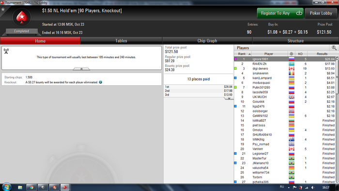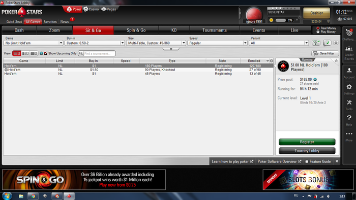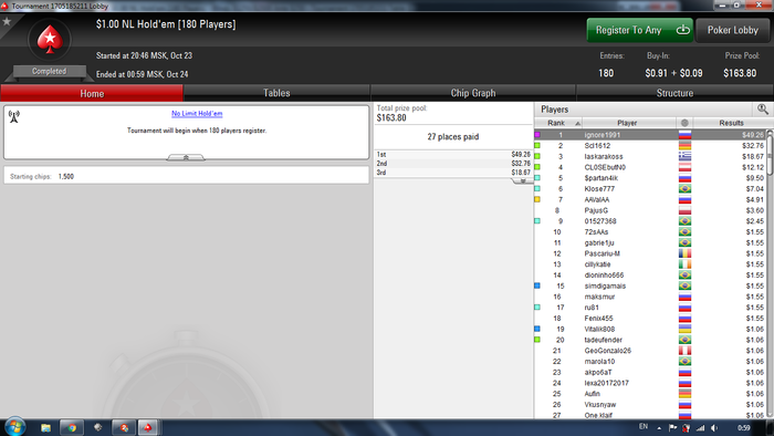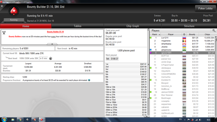 5-й день (18 октября). Итог за сегодня +11$. Бр 216$/1400 Все также топучусь на месте . За собой заметил около 4 ошибок я мог бы сыграть лучше. Моим 3 бетам верить перестали или карта реально заходила опонентам карты хз, такое ощущение что 3 бетить в блеф не стоит. Утром 3 раза был баблбоем из 15 сыгранных. Утро +12$ сыграл, вечерняя загрузка -1$ вышла. Я до 22 часов не мог загрузить так, что бы было 6 открытых столов просто вылетал в турнирах на ура каждые 5-10 минут.