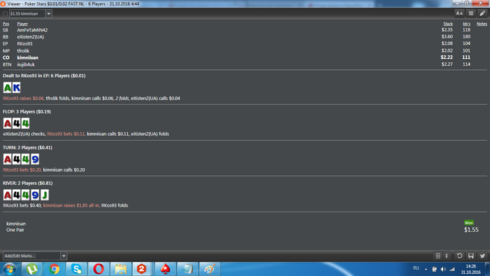 okerStars Zoom Hand #160683347371: Hold'em No Limit ($0.01/$0.02) - 2016/10/31 11:44:23 MSK [2016/10/31 4:44:23 ET]