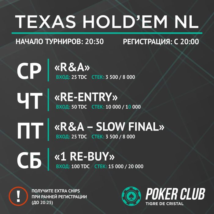 Дорогие Друзья! Расписание покерных турниров на эту неделю. Дни проведения: среда, четверг, пятница, суббота. Регистрация с 20:00. Начало в 20:30. EXTRA CHIPS – это дополнительные фишки, которые выдаются при ранней регистрации до 20:25.