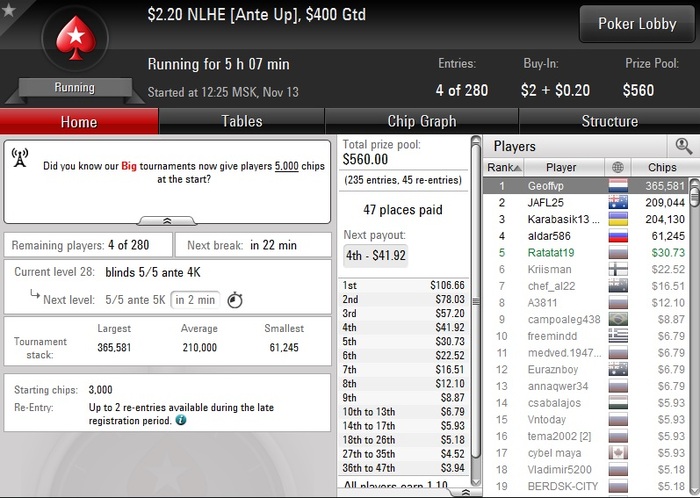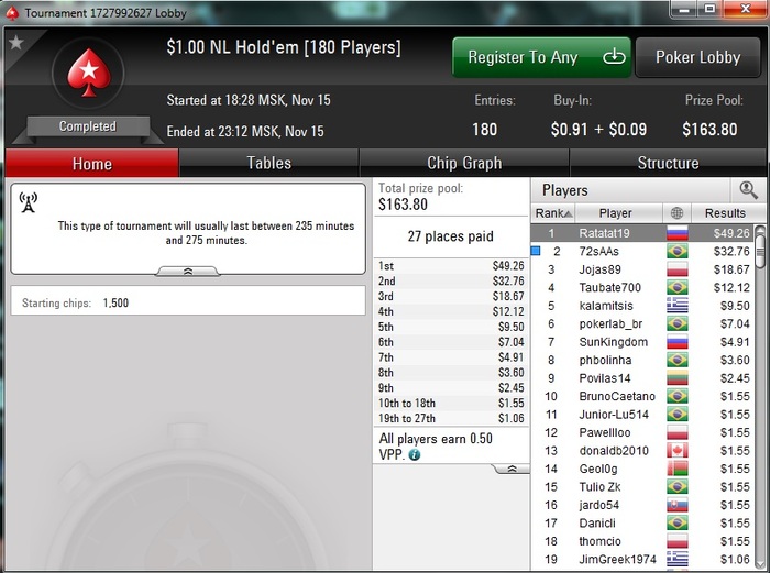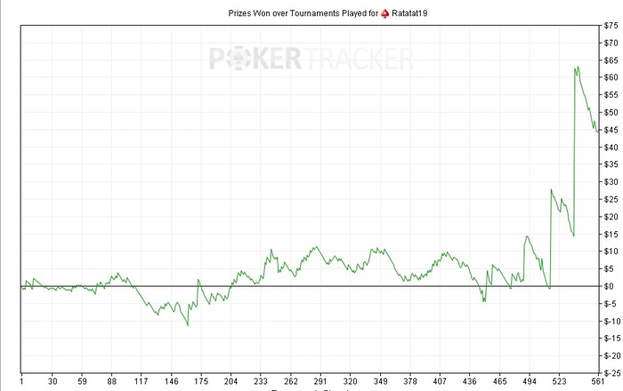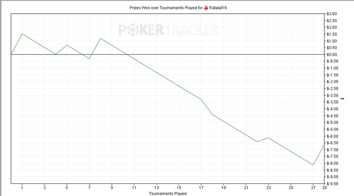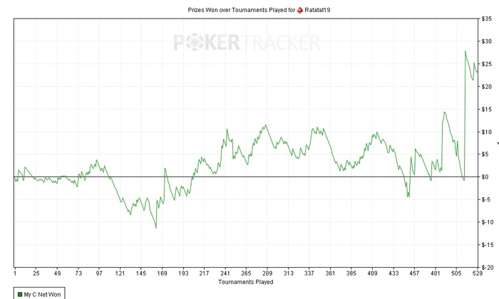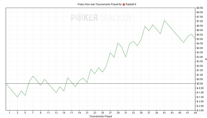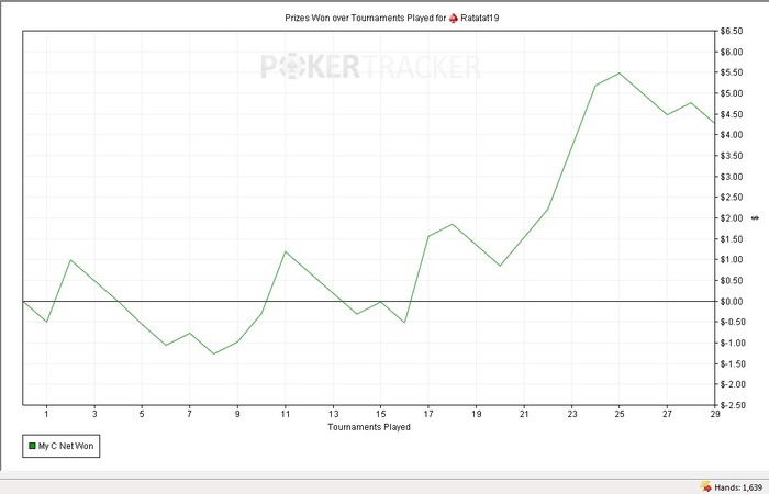 в последнее время не много играю, курсачи писать нужно, да и желания нет. выиграл сегодня сатт за 0.33 на сандей сторм. потом покатал мтснг на 45 тел 0,5 , где в 5 столах вылетел с КК и всего 1 итм вышел. +6 $