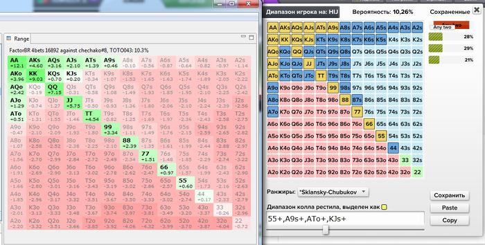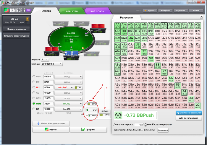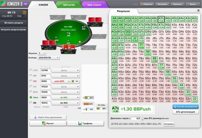 В основном я пользуюсь ХРК для расчета пуш/фолда, но пару месяцев назад появился ИЦМАЙЗЕР(он правда чаще всего лежит на полке, но иногда я считаю ицм- споты на предфиналках-финалках. И тут решил сравнить обычный чип ЕВ спот в этих двух программах: Poker Stars $10+$1 No Limit Hold'em Tournament - t200/t400 Blinds + t50 - 7 players - View hand 2984921 DeucesCracked Poker VideosHand History Converter