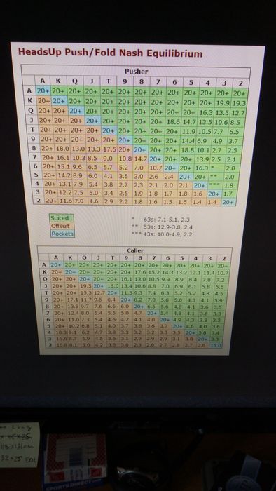 Wep6el, ну симпл это единственный бесплатный адекватный пуш фолд тренажёр. оперативы только жрёт много. ещё можешь попробовать холдем чарт, он платный, но есть триал на пару недель, а там уж думать. тоже очень хорошая прога, тем более для пиханины. там неш, только с поправками на кол-во человек, блайндов и позиции, ну и соответственно для ситуаций пуша и кола пуша. единственный минус, что как и на все остальные проги, на него ругаются старзы ,если он запущен одновременно с ними