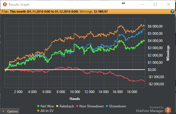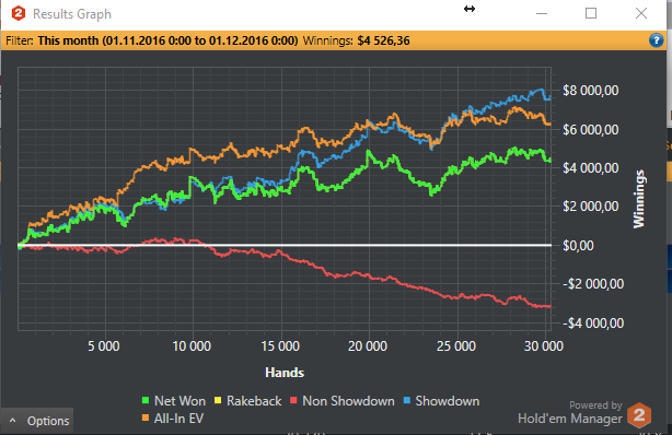 Месяц вроде неплохо шёл, и я исправно следовал своим целям, но к концу месяца я расклеился и вот последние дней 5 к игре испытываю мало интереса , мало играю, над теорией не работаю. Рук не много, так как пропустил ещё и первую неделю месяца. Результат более-менее, но могло быть намного лучше. С ленью и дизморалью ,думаю, справлюсь, не впервой как никак. Пока в приоритете научиться ложиться раньше, чем 4 утра, чтобы не вставать тогда, когда уже почти темнеет, что почему-то вызывает у меня немалую часть и лени и дизморали. В декабре-минимум поблажек самому себе и минимум 50к рук.