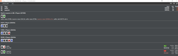 Тем не менее в хэдзапе, против оппонента, который был на голову слабее и имевшего на начало хэдхапа в 4 раза меньше фишек, пришлось играть целый час, так как в начале я два раза неудачно блефанул, и почти сразу же проиграл такое