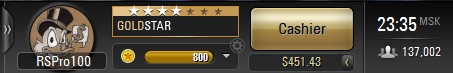 Покер рум: Статус: Играемые дисциплины: 1. Сash лимит nl10, если банкролл достигает отметки 1250$ перехожу на nl25 с стоп-лоссом 10 БИ. 2. Микро МТТ фризауты до 3.30$.