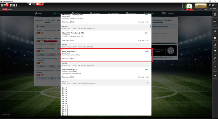 Я сделал ставку в лайве на победу Рубина в матче с тульским Арсеналом в рамках 16 тура РПЛ. Матч закончился со счётом 1:0 в пользу Рубина. По окончании матча ставку рассчитали верно и её статус был "Won". Менее часа назад PokerStars/BetStars поменяли статус с "Won" на "Lost" и сняли со счёта сумму ставки и сумму выигрыша. Написал письмо в Службу поддержки, но ответа пока нет. Проверьте у себя в истории ставок этот матч.