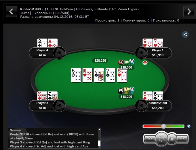 Играл сат на Мандей Миллион за 22$, 500 мест Гэренти. Проиграл 2аллина подряд 70 на 30 и 80 на 20. Бред. Но ещё больше смешно то, что после вылета я сразу не закрыл стол и произошла следующая раздача: рейз-очень большой стек ререйз-игрок с тремя стартовыми аллин-пас-большой стек колл с QQ, у другого KK, флоп с дамой - бред.