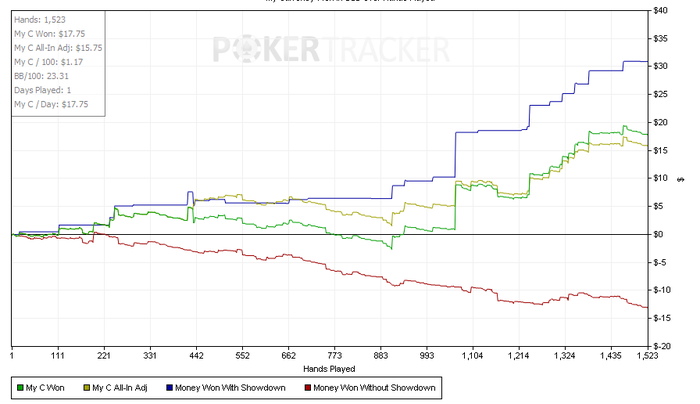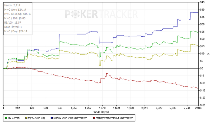 Сегодня полночи делал "срочности" по работе. Потом поиграл совсем чуть-чуть, пока не стал засыпать за столами. Сыграл всего, смешно сказать, 338 рук. Зато с винрейтом 51ББ/100. Повезло...