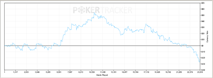 В воскресенье играл из за работы мало, и играл очень плохо. Расслабился, отвлекался на клипы, твич, кофе, ... Потом в полусонном состоянии пытался снизить "минус сессии". А мой "автопилот" пока видимо не может бить NL5. В итоге, вчера в турнирах получилось минус 3 бакса, а в кеше минус 23 (правда с недобором).