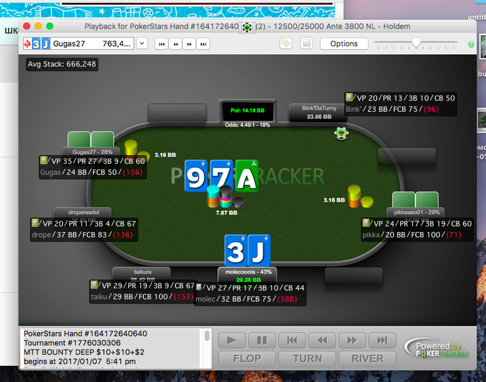 Во вторых - У оппонентов 20-25 ББ и мне кажеться что со всем диапазоном с которым СБ делает колл он платит и твой рейз. Баттон на твой рирейз выкидывает только мусор, но предполагаю что он должен понимать что дровяной флоп с Тузом очень отличается от сухого флопа с Тузом с мусором даже при двух чеках он конбетить не должен.