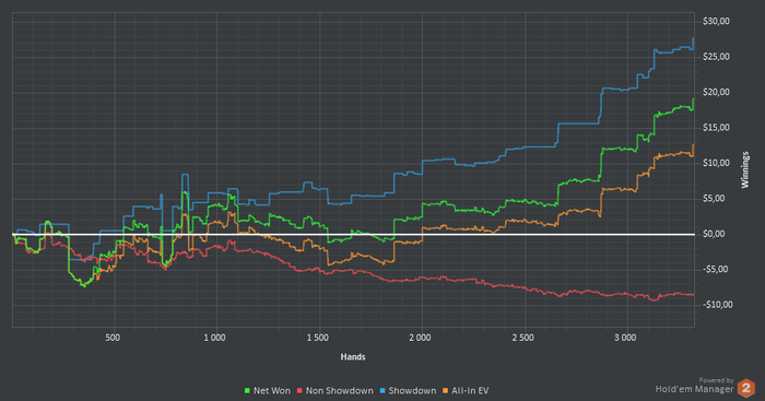 Совсем мало времени уделял катке (курва! как назвал меня один крайне невоспитанный рыб с Восточной Европы, когда я отнял у него полтора стэка). График NL2 в перемешку с NL5. БОльшая часть с профита на двойках. Как верну своё честно награбленное по ЕВ, так начну замешивать пятерки с десятками. Не могу я так просто оставить это дерьмо