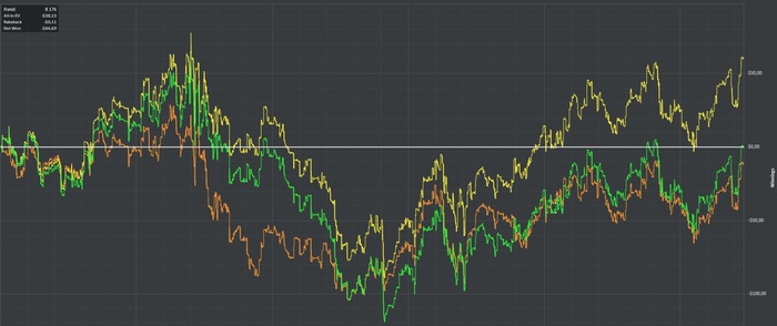 Всем привет, вчерашний день состоял из 2х сессий: +20 и -51. Всего по итогу дня с кешбека БР стал 373. Сессия запомнилась отмороженным регуляром 33/26 за 500 рук, который впал втильт и ставил олыны каждую руку в течении наверное 30 рук подряд, он выставлялся на всём, Т3о и прочий мусор был в его олынах, я на нем выиграл +3.5 стэка но в итоге ему зашло и я -3 ему вернул. Сессия запомнилась кучей куллеров, оппонентам доезжали бекдоры, топсеты и убивали мои вторые натсы, так что отчасти это не моя вина в таком лузе, учитывая что шёл +30 получается крутанулся вниз на 8 стэков. Вот для этого нужен крепкий БР и постоянный рб. Когда я играл нл30, старался поддерживать бр>50би, на нл10 надеюсь 40би хватит.