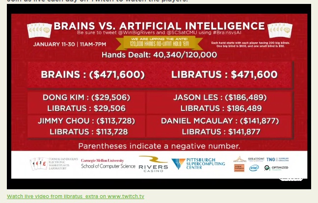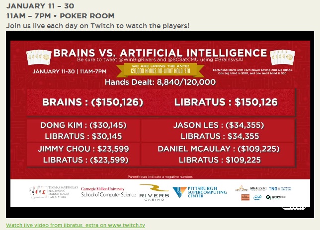 Сейчас в Питсбурге проходит турнир между программой Libratus и четырьма профессиональными покеристами. Играют в HU NL Holdem. Каждая раздача начинается со стека в 200 бб. Всего собираются сыграть 120 тысяч раздач. Вот (https://nplus1.ru/news/2017/01/11/beta-poker) ссылка на новость. А здесь прямая трансляция на твиче. Как считаете, какие шансы у программы?
