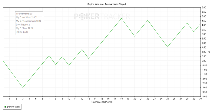 С момента последних изменений в игре отыграл 30 турниров. Сложно играть больше, так как играю один стол. Я честно пытался подключить второй стол, но сразу же теряю концентрацию. В общем нужно автоматизировать свои действия с учетом новой стратегии.