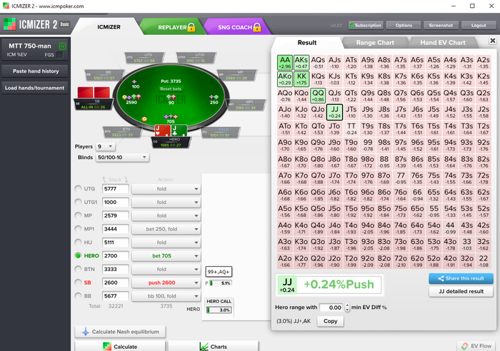 fold, fold, fold, MP+1 raises to 2.25 BB, fold, Hero raises to 7 BB, fold, SB raises to 25.74 BB and is all-in, fold, fold, fold