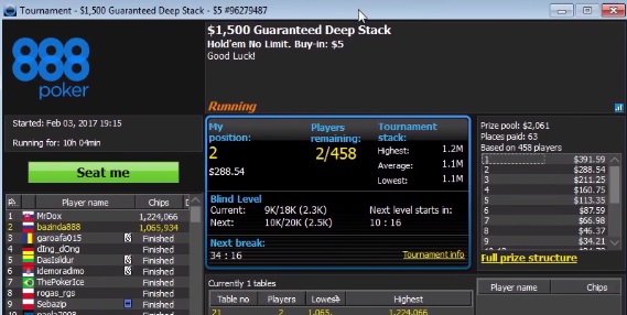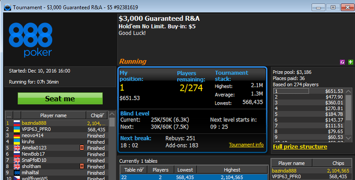 Все это дело я стримил. Оставлось всего несколько столов без стадий,мне стало скучно и я остановил загруз туриков и прикрыл стрим. Через 1 час открывается турик..Оо Какого? Я же отменил загруз?! Захожу в лобби,а там еще один турик в загрузке висит .Быстренько отменил регу и продолжил катать оставшиеся три стола. Повылетал выстренько из 2ух туриков и остался 1 стол за 5 баксов дипстек. Турнир нудный,никто вылетать не хочет,до мин.кеша еще оч долго,в общем-все плохо. Сижу за столом,никого не трогаю,иногда нажимаю на кнопки. Через 2-3 часа,каким-то волшебным образом зачемаю,что у меня неплохой стек,да и стадий уже какая-никакая идет. Стал болльше обращать внимание на столик,ну .. чаще тыкал на рейз,все дела... Хоп-Хоп и уже преФТ. ЗАпустил стрим и давай трындеть. Складывалось пздц! Три раза влетел в натсы,выставившись префлоп и три раза затащил Тут все стало понятно.КАк выразился один челик из чатика: аппарат уже определил вылетивших В турике, на ФТ, сидел тихо и не питюкал. Стека не было,ребята активные,но как только появился стек- я пошел в атаку. Потел я в той атаке.. Закругяюсь. Что-то много букав уже. пзпзп лобби турнира закрылось само-собой и пропало,поэтому скрин сделал из видеозаписи стрима