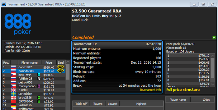 Все плохо.... начиналось. Попал на финалку фриза за 3 бакса и отлетел 5 ( копейке) Попал в мин.деньги в 12-ом (top12) ребайнике и получил больше,чем за топ5 фриза. Еле-еле прополз в итм:бился,как лев,выбрасывал все.