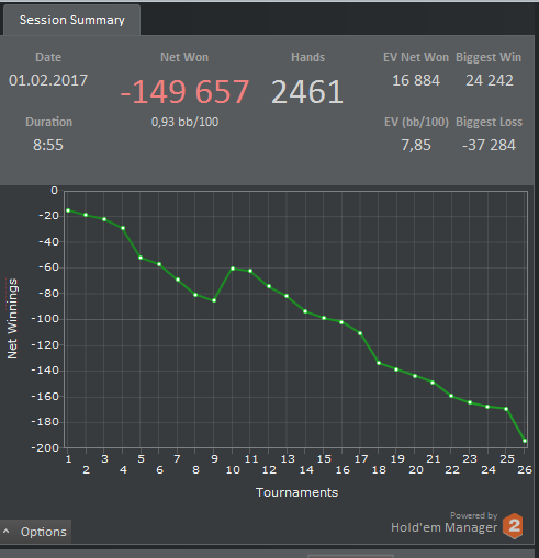 Больно,хлопотно и без выхлопа. Это кратко о сегодняшнем дне. Были две раздачи,на префт,когда требовалось принять оч.сложное для меня решение. Вполне возможно,что я ошибся в этих двух раздачах,тем самым подписав себе смертный приговор....если бы,да ка бы,то во рту выросли б грибы. Уже нечего рассуждать о том,чего не было,главное сделать выводы. Пока я их не сделал )