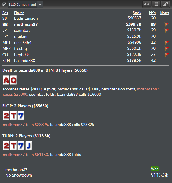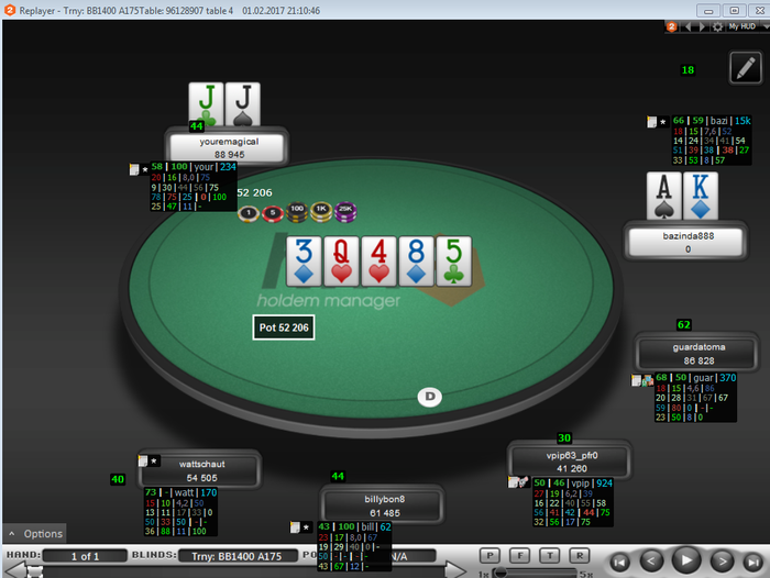 Ночью вызвонил знакомый и предложил покуралесить. Я согласился В итоге лег поздно и проспал начало(всего-то 6ч) сессии. Ну я и марафонец Ну ничего,вечерние турики тоже неплохо зашли. Сосал на протяжении всей катушки О хорошем: оформил финалку в турике за 12$, смог занять 2-ое место,тем самым не только отбил минус,но еще умудрился плюсануть Ключевая раздача ХА: Положил оппа на оезд и пару блефов без эквити + на допер Т6. Принял решение играть на стек по терну.Вышел терн и я задумался,а может не стоило закладывать ничего и просто выбросить,?Ну уже поздно,подумал я,получил же усиление,фишек много,а карта не подходит оппу! В АТАКУ !
