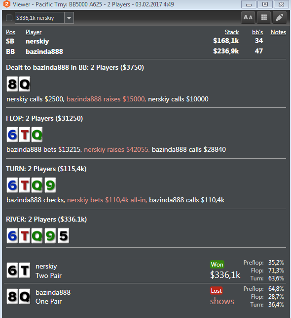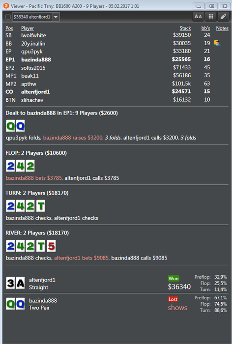 опп 371hands 22\16\9\25 3B s SB 16% Cbets F94(18)-T70(10)-R50(2) Руку, которую показал опп я не ожидал увидеть. Если честно,то спектр его 5бета тут размыт и я не совсем понимал против чего играю. Повезло,что доска оказалась низкой и спаренной,решения о колле давались не так уж сложно.