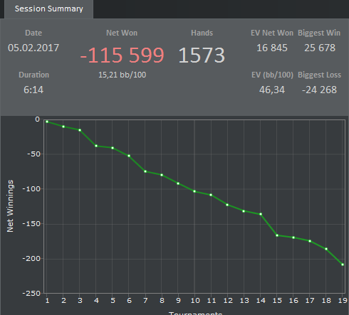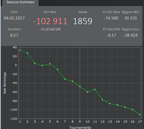 Day4 -114.35 Оформил две преФТ (10-11 места~) Вылетел по грязи,само собой Тузы в короли раз 15-ать ! Ага,ага. Так сильно расстроился,что начал блефовать в самые неподходящие моменты и в самых отпетых оппов,без какого-то ни было понимания происходящего . В итоге залил несколько туриков самым непотребным образом Сегодня был день сетов(10~). Как не открою карман,так выпадает сет. Ну,думаю сегодня покажу отличный винрейт, все дела. Зашел в Хм и чуть не заплакал.
