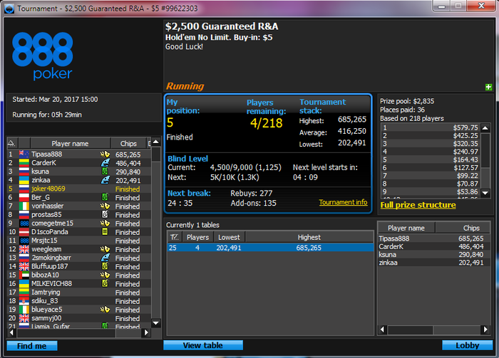 Pacific, $4.55 Buy-in (2,500/5,000 blinds, 625 ante) No Limit Hold'em Tournament, 4 Players Poker Tools Powered By Holdem Manager - The Ultimate Poker Software Suite.