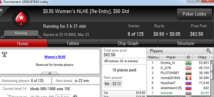 женские турниры начинаются жестче чем СНГ... 24 игрока- 4 итма! видимо, девушки просто опаздывают))))) поребаятся по 5 раз по 0,55$ чтобы выиграть 1,5$ . один раз и я так грешила, теперь бью себя по рукам))) ну а меня бьют другие девушки