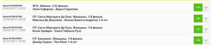 Взял бонусные 6200RUB и поставил 2 матча в Майами и 1 матч на челленджере в Гвадалахаре 1)Михаил Кукушкин - Бернард Томич.Начнем с самого большого кэфа в прессе это Мишаня Кукушкин.Миша на ходу,да уступил в финале в Ирвинге ну все-таки провел очень хороший турнир и здесь же в Майами провел 2 матча квала не отдав не сета своим оппонентам,против него Бернард Томич,человек который реально мягко говоря забил на теннис,просто не получает от игры удовольствия,сливает всем и вся очень безхарактерно играет, просто пора уже завязывать ему с теннисом.Последние 5 матчей Томича 0-5,у Миши 4-1 и единственное поражение только лишь в финале Альяжу Бедене.Болеем за Мишаню за хороший кф.Томич домой!) 2)Робин Хаазе - Микаэль Имер Скажу коротко слабый из братьев Имеров будет играть с Робином,ну и тут Хаазе должен завозить небольшую минусовую фору против молодого шведа. 3)Виктор Эстрелья - Мохаммед Сафват.Ну и последний матч в нашем прессе это Эстрелья,который 1-сеянный здесь уже прошел он очень крепкого челленджериста Эмилио Гомеса закрыл его в двух партиях.Так что тут Виктор должен проходить египтянина,да египтянин в принципе неплох,но все же Виктор классом намного выше и должен проходить дальше